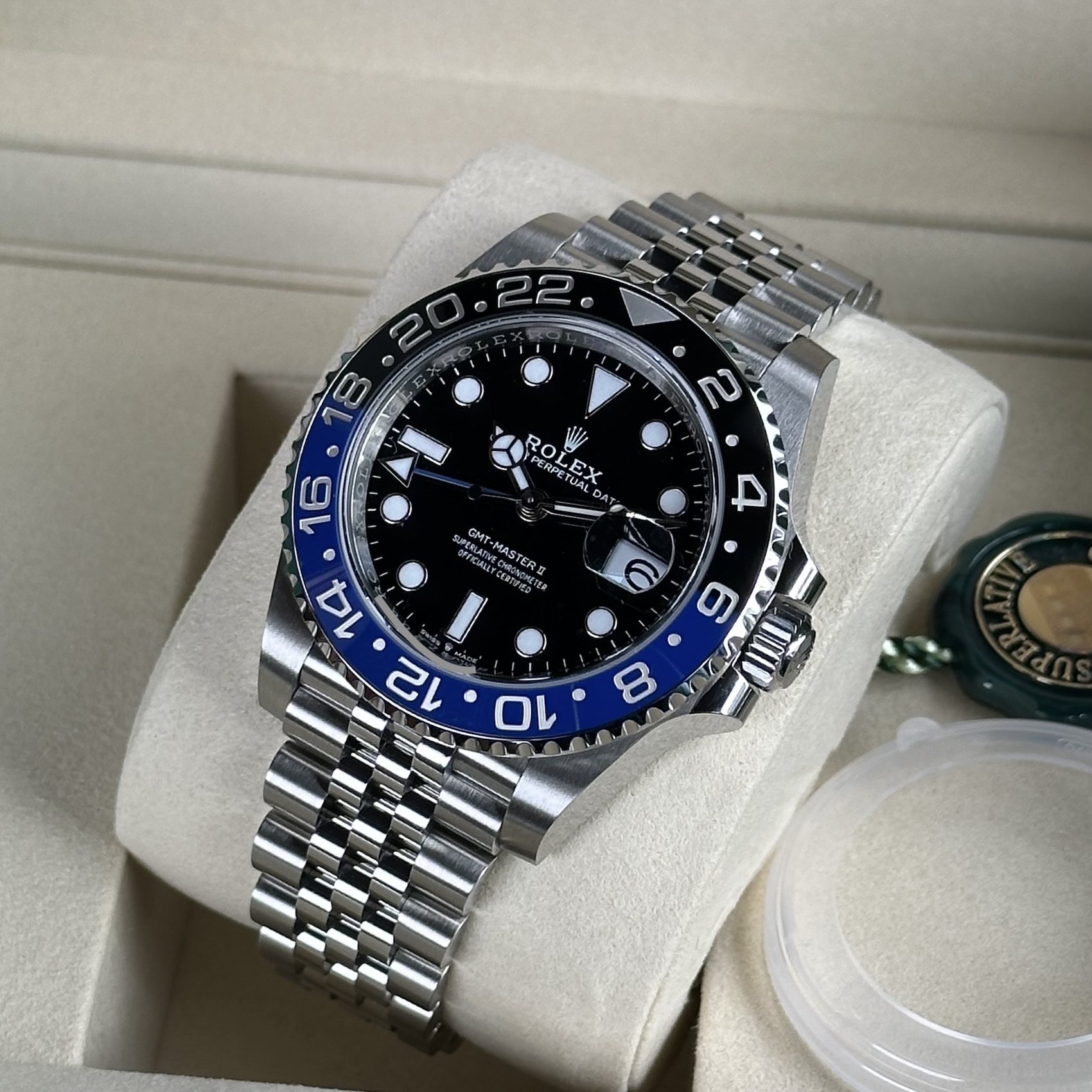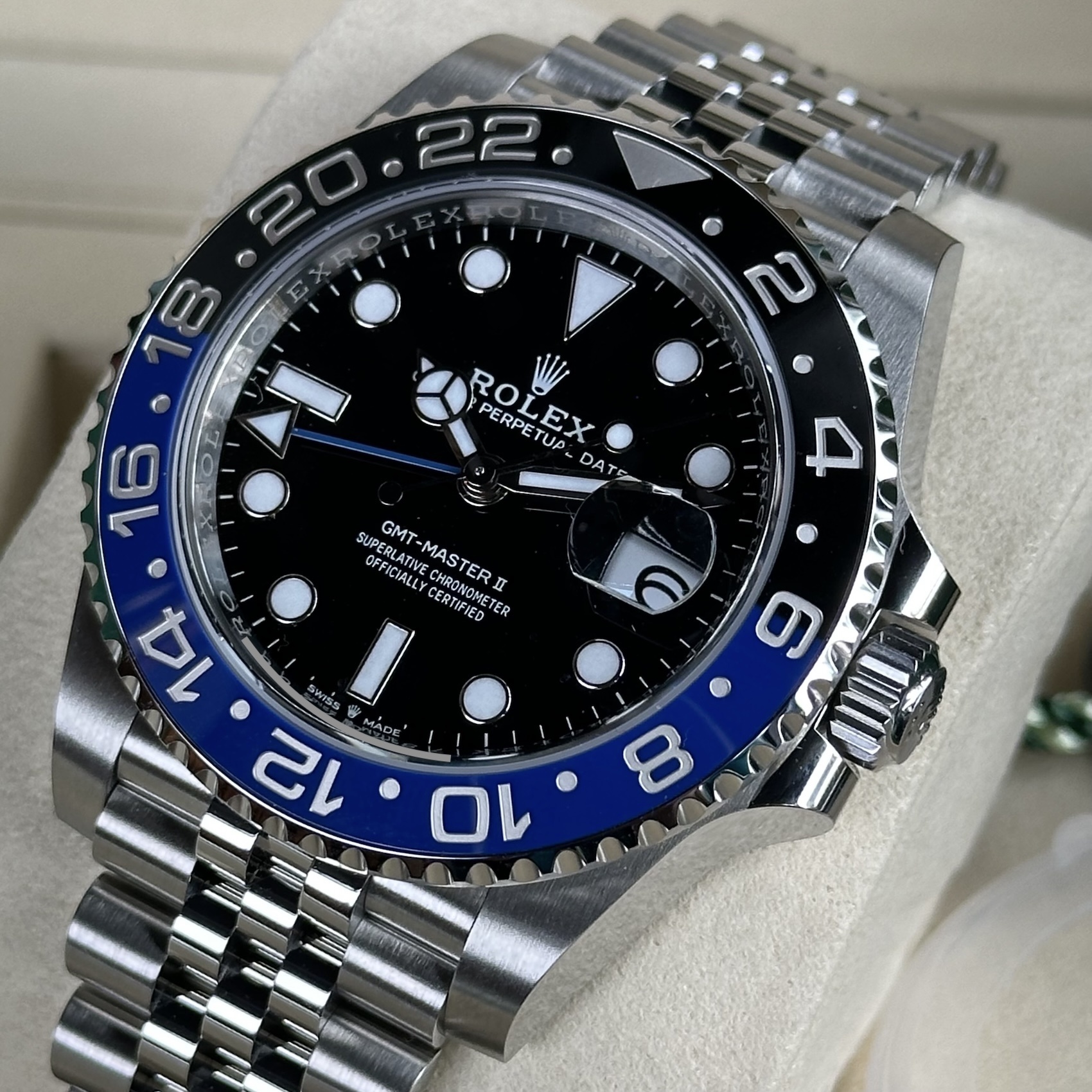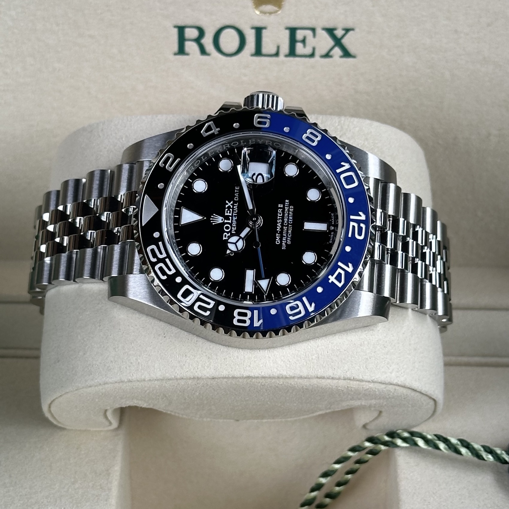 Hier präsentieren wir Ihnen eine ungetragene Rolex GMT-Master II Ref.126710BLNR Batgirl aus 2025 mit Original Box und Papieren. Gerne können Sie die Uhr in unserem Geschäft in Koblenz zu unseren Geschäftszeiten besichtigten bzw. erwerben. Bei allen Fotos handelt es sich selbstverständlich um Originalaufnahmen der jeweils gezeigten Uhr. Diese wurde unter anderem auf Ganggenauigkeit und Wasserdichtigkeit getestet. Sie erhalten somit stets eine aus Meisterhand geprüfte Uhr. Durch unsere langjährige Erfahrung und unser Know-how in der Uhrenbranche sind wir für Sie die Adresse für den An-und Verkauf von gebrauchten Luxusuhren sowie Vintage Uhren. Überzeugen Sie sich selbst und besuchen unseren online shop chrono-world24 indem Sie unabhängig von unseren Geschäftsöffnungszeiten, jederzeit einen sicheren sowie sorgenfreien Online Kauf tätigen können oder besuchen unser Juwelierfachgeschäft im Herzen von Koblenz indem Sie Ihre neue Uhr persönlich besichtigen, abholen und bezahlen können.