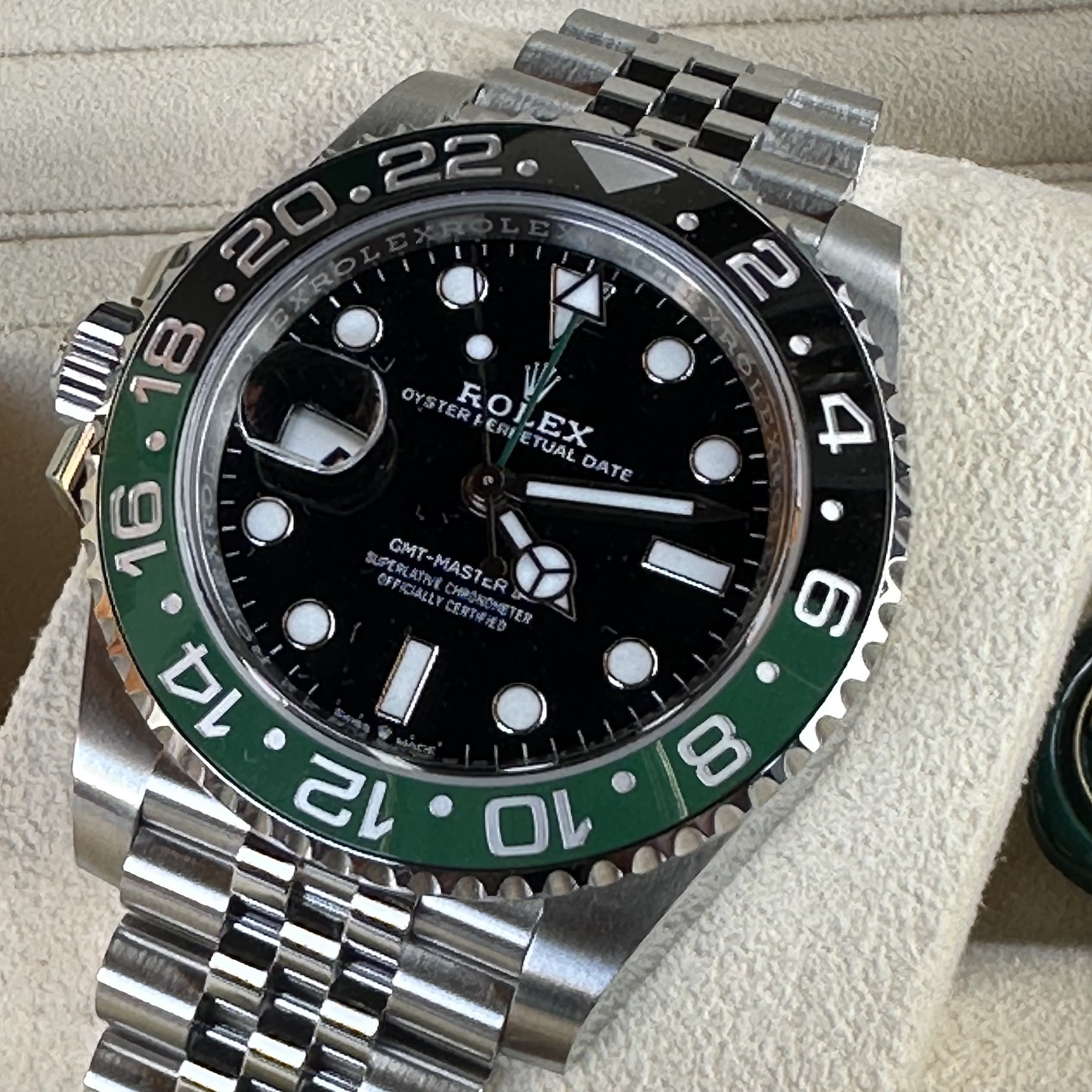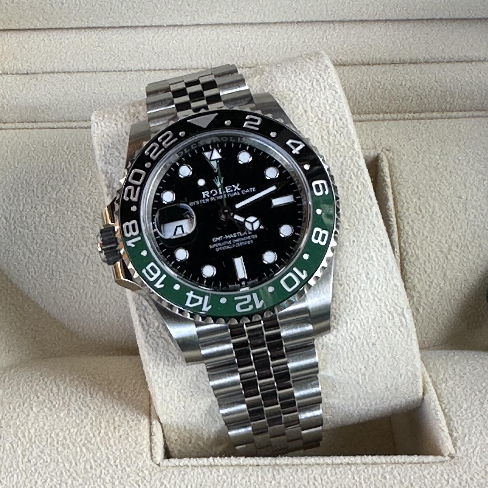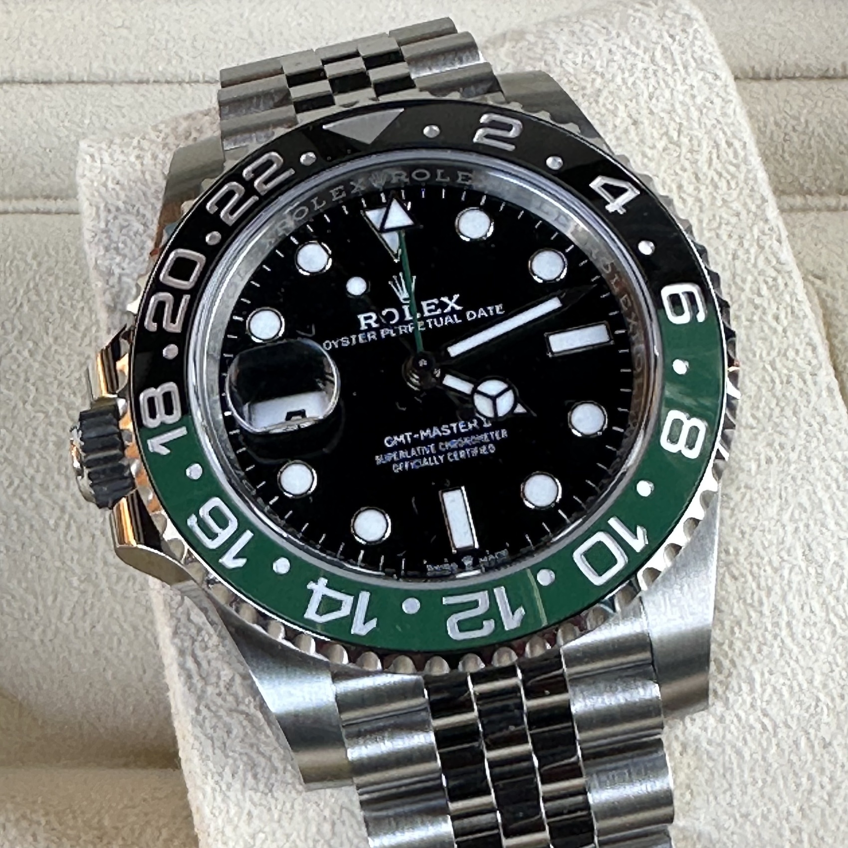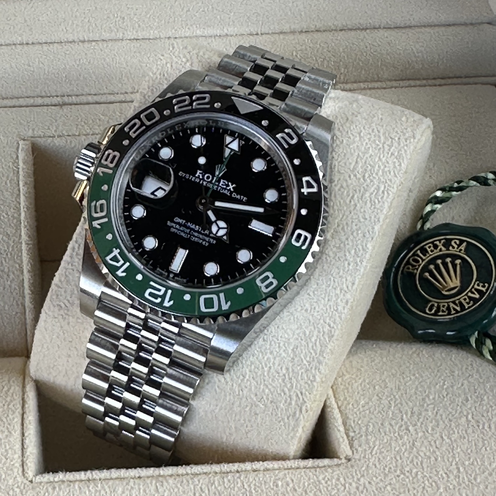 Hier präsentieren wir Ihnen eine ungetragene Rolex GMT-Master II Ref.126720VTNR Sprite LC Eu aus 2022 mit Original Box und Papieren. Alle "Spuren" an der Uhr sind Reflexionen oder Staubkörner. Gerne können Sie die Uhr in unserem Geschäft in Koblenz zu unseren Geschäftszeiten besichtigten bzw. erwerben. Bei allen Fotos handelt es sich selbstverständlich um Originalaufnahmen der jeweils gezeigten Uhr. Diese wurde unter anderem auf Ganggenauigkeit und Wasserdichtigkeit getestet. Sie erhalten somit stets eine aus Meisterhand geprüfte Uhr. Durch unsere langjährige Erfahrung und unser Know-how in der Uhrenbranche sind wir für Sie die Adresse für den An-und Verkauf von gebrauchten Luxusuhren sowie Vintage Uhren. Überzeugen Sie sich selbst und besuchen unseren online shop chrono-world24 indem Sie unabhängig von unseren Geschäftsöffnungszeiten, jederzeit einen sicheren sowie sorgenfreien Online Kauf tätigen können oder besuchen unser Juwelierfachgeschäft im Herzen von Koblenz indem Sie Ihre neue Uhr persönlich besichtigen, abholen und bezahlen können.